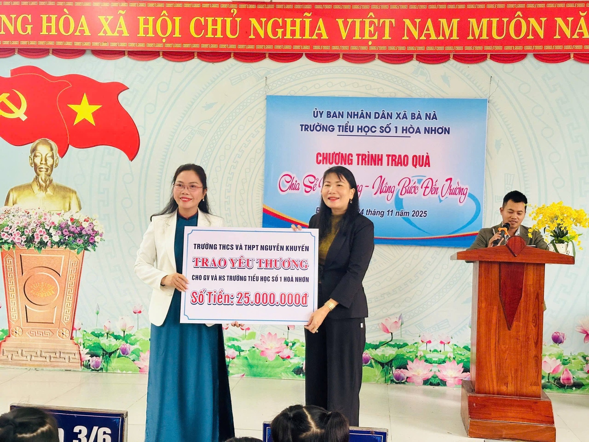 Ngay trong tuần vừa qua (24/11/2025), đại diện lãnh đạo Trường THCS và THPT Nguyễn Khuyến đã trực tiếp đến thăm hỏi, động viên và trao tặng quà ủng hộ cho thầy và trò 02 trường ở xã Bà Nà và xã Hòa Vang – những đơn vị chịu ảnh hưởng nặng nề của đợt mưa lũ vừa qua. Những món quà tuy không lớn về vật chất nhưng chứa đựng tình cảm chân thành, sự sẻ chia sâu sắc của tập thể nhà trường, mong muốn giúp các bạn học sinh và thầy cô giáo sớm ổn định cuộc sống, vượt qua khó khăn để sớm trở lại với nhịp học tập và giảng dạy bình thường.