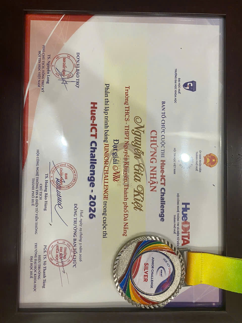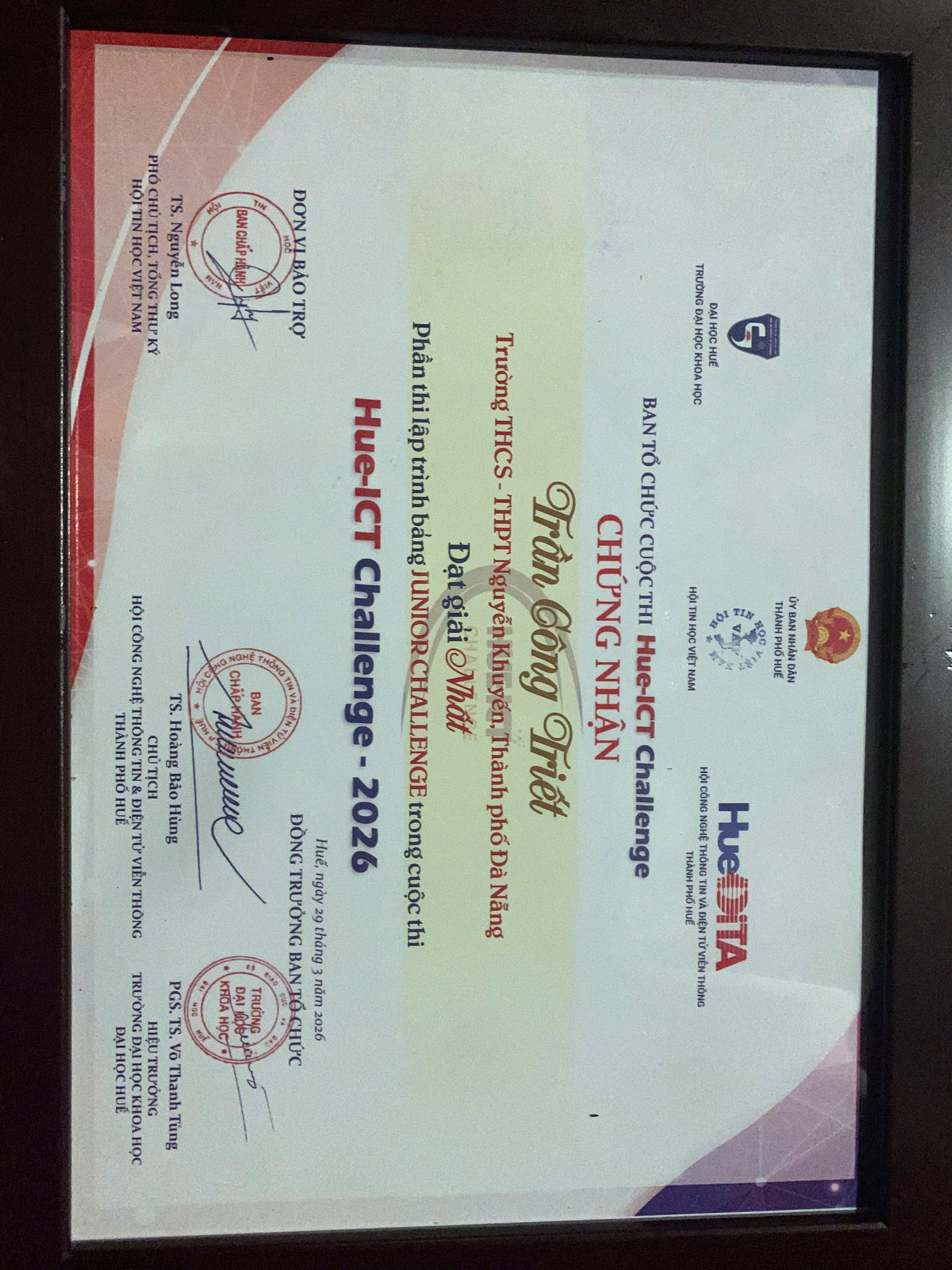 Thay mặt Ban Giám hiệu và toàn thể cán bộ, giáo viên, nhân viên nhà trường, xin chân thành chúc mừng em Trần Công Triết và Nguyễn Gia Kiệt đã đạt thành tích xuất sắc tại Hue ICT Challenge 2026! Hy vọng các em sẽ tiếp tục phát huy tài năng, gặt hái nhiều thành công hơn nữa trong tương lai.