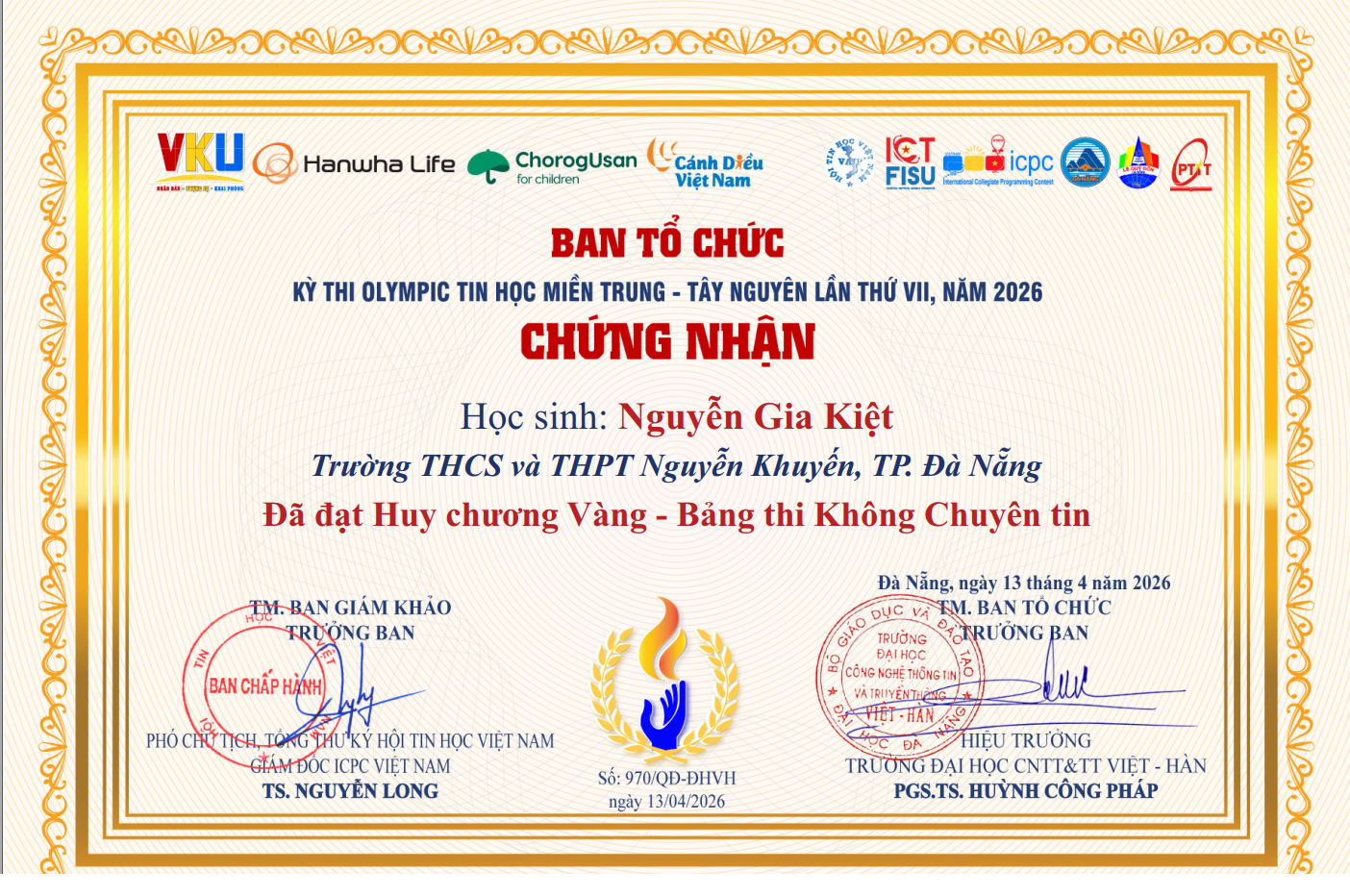 Nhà trường xin chân thành chúc mừng em Nguyễn Gia Kiệt và Trần Hoàng Nguyên đã đạt thành tích xuất sắc tại Kỳ thi Olympic Tin học Miền Trung – Tây Nguyên lần thứ VII năm 2026! Hy vọng các em sẽ tiếp tục phát huy tài năng, đam mê công nghệ và gặt hái thêm nhiều thành công hơn nữa trong tương lai, góp phần khẳng định thương hiệu giáo dục mũi nhọn của nhà trường.