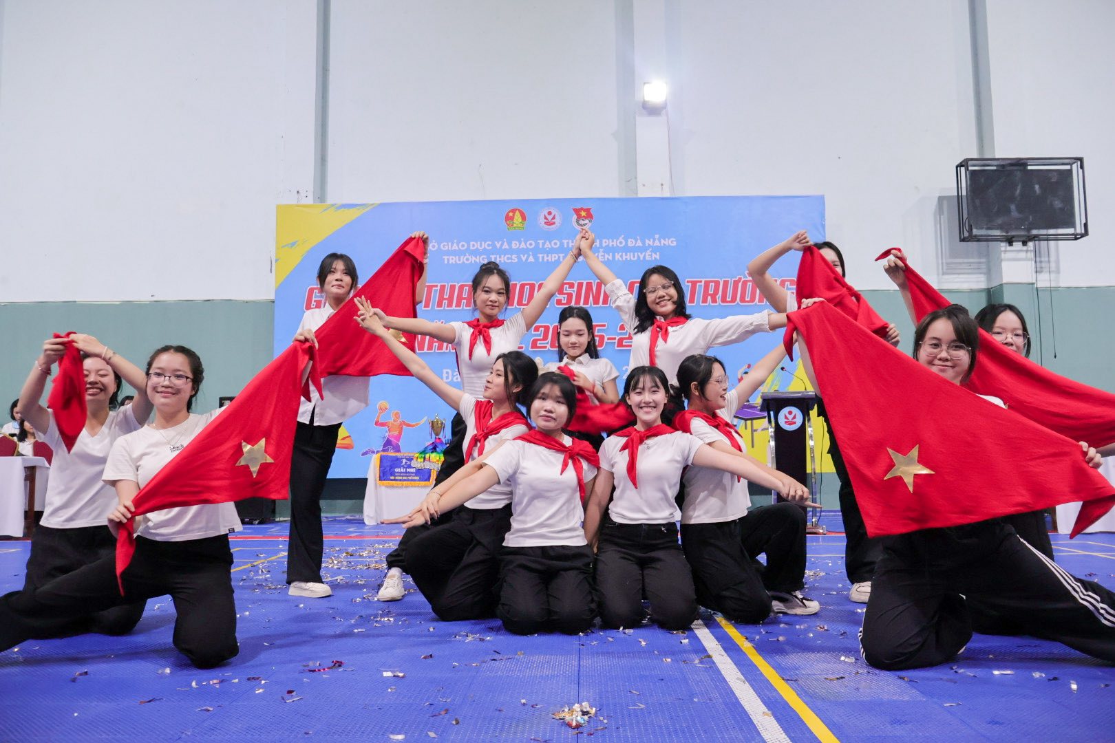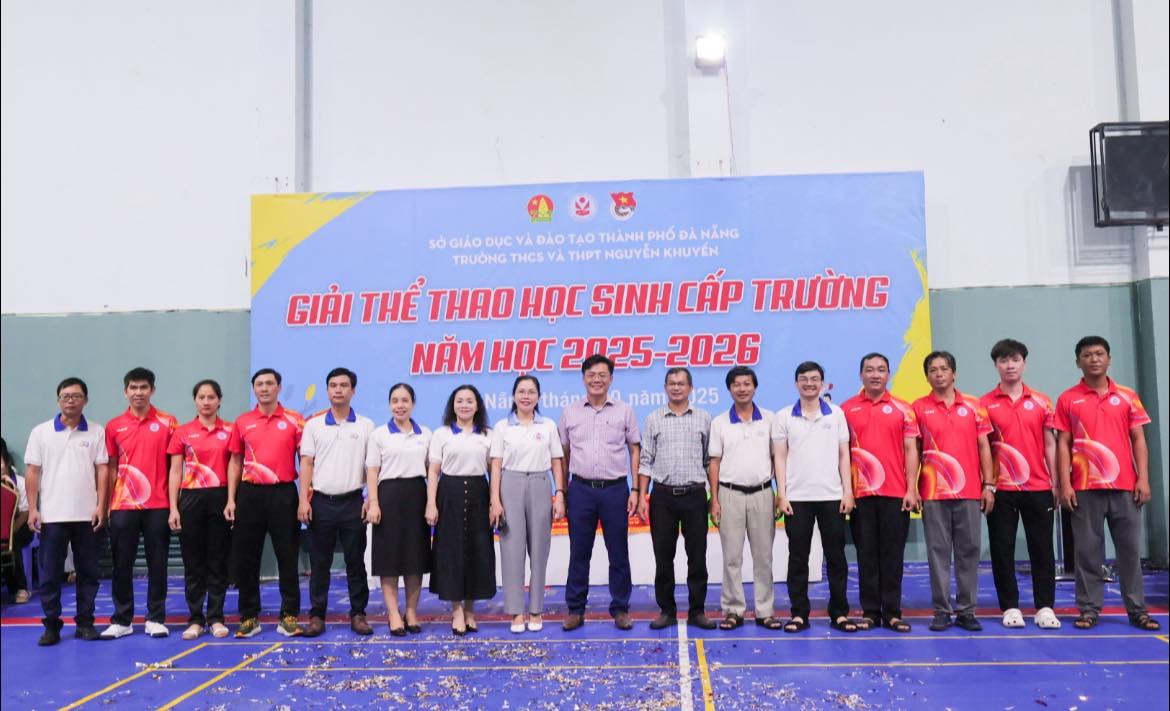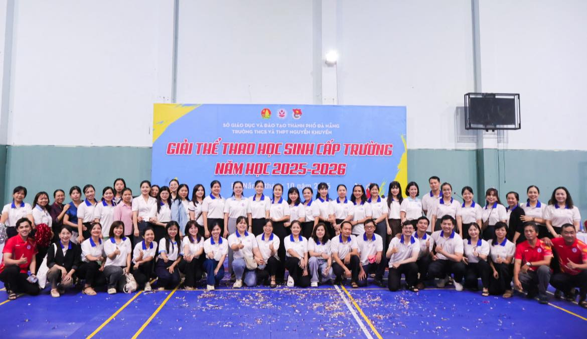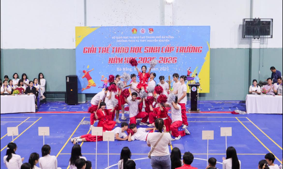 Sáng ngày 10/10/2025, trường THCS và THPT Nguyễn Khuyến tràn ngập trong không khí hân hoan của Lễ khai mạc Giải thể thao học sinh cấp trường năm học 2025 – 2026. Trong nhà Đa năng, tiếng trống khai hội vang dội, lan đi giữa tiếng vỗ tay, tiếng reo hò đầy phấn khích. Những tà áo xanh đồng phục xếp thành hàng ngay ngắn, nụ cười rạng rỡ vẫn nở trên môi – như ánh nắng nhỏ sưởi ấm không gian giữa ngày mưa se lạnh.
